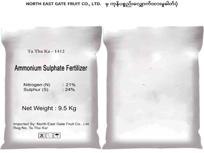 | 1222 | Sunrise Globle Co., Ltd. | Ammonium Sulphate Fertilizer | (50 Kg), (1, 1.25, 1.5, 24 TNE) | (N:21%, S:24%) | SFR-IE-002848 | 1300 | ၁၉.၃.၂၀၂၈ | AS |