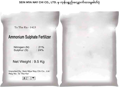 | 1203 | Myint Mo HinThar Co., Ltd. | Ammonium Sulphate Fertilizer | (50, 1000, 1250 Kg, 25×50Kg=1250Kg), 25 TNE | (N : 21%, S : 24%) | SFR-IE-002792 | 1281 | ၁၉.၃.၂၀၂၈ | AS |