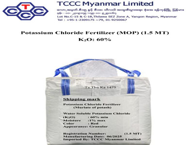 | 21 | Old Lady Co., Ltd. | Muriate of Potash Fertilizer ( MOP ) ( UZKIMYO IMPEKS ) | 50 kg | (K2O:60%) | 033 | ၁၃.၁၁.၂၀၂၅ | Potash | |