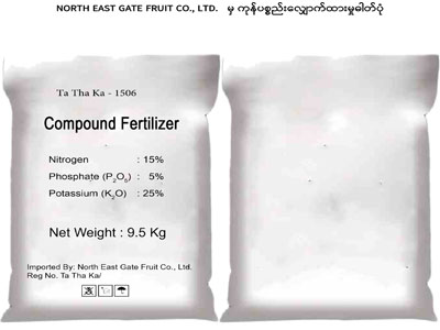 | 1234 | Global Crop Co., Ltd. | Compound Fertilizer(15:15:15) | (1000 , 1250 Kg) | (N : 15%, P2O5 : 15%, K2O : 15%) | SFR-IE-002691 | 1312 | ၁၉.၃.၂၀၂၈ | Compound |