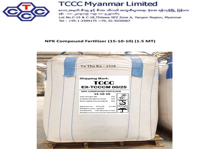 | 1271 | Myanma Taiza Agriculture Co., Ltd. | Compound Fertilizer ( 15-15-15-7S) ( Raw Material ) | (1 , 1.25 TNE), Shipment | (N : 15%, P2O5 : 15%, K2O : 15%, S : 7%) | SFR-IE-002881 | 1349 | ၁၉.၃.၂၀၂၈ | Compound |
