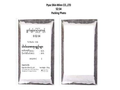 | 45 | Toe Pwar Mandalay Myaysihlwa Co.,Ltd | Potassium Sulphate Fertilizer ( LUO BU PO) | 50kg | (K2O≥52%, Cl ≤ 1%, S≥17.5%) | 060 | ၁၃.၁၁.၂၀၂၅ | Potash | |